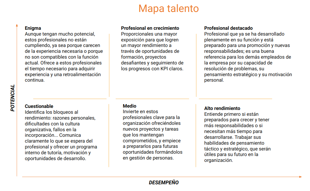Análisis de mapa de talento del equipo (midiendo desempeño y potencial) y contrastando con el modelo.